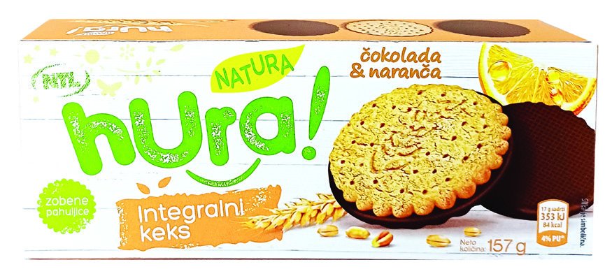 Keks integralni okus naranče preliven čokoladom Hura natura, 157 g, u NTL trgovinama