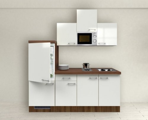 š 210 x d 60 cm, iverica, plastificirana površina, biserno bijela boja u kombinaciji s orahom, radna ploca 38 mm, mikrovalna pecnica 'PKM 700 - 17N UB': podelementna, 17 l, 700 W, šest programa rada, funkcija odmrzavanja i signal završetka rada, dim. 26,3 x 43,2 x 32,8 cm, ugradbena ploce za kuhanje: 1 x Ø 145 mm, 1.500 W i 1 x Ø 180 mm, 2.000 W, ugradbeni hladnjak 'PKM KS 120.4A+EB': energ. klasa A+, potrošnja 183 kWh / godišnje, 122 l, razina buke 41 dB, zamrzivac, posuda za povrce, dim. 88 x 54 x 54 cm, podesiv termostat, automatsko odleđivanje