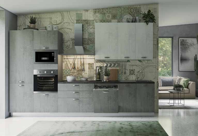 dekor betona, dim.: 360x240x60 cm. U cijeni kuhinje uključeni su Beko aparati: staklokeramička ploča za kuhanje HIC64401, pećnica BBIE12100X/A, hladnjak s ledenicom BCSA285K4SN/E, perilica posuđa BDIN25320/E, napa ELICA CERTOSA 90/E, mikrovalna pećnica BMGB25332BG i sudoper Mondial 86x50 (04020012/02)