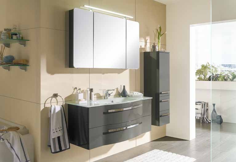 boja: siva visoki sjaj, element s umivaonikom, dim.: 117x48x48 cm, 2 ladice, element s ogledalom, dim.: 120x72x17 cm, 3 vrata, s LED rasvjetom en. učinkovitosti A-A++. Uz nadoplatu dostupan bočni element