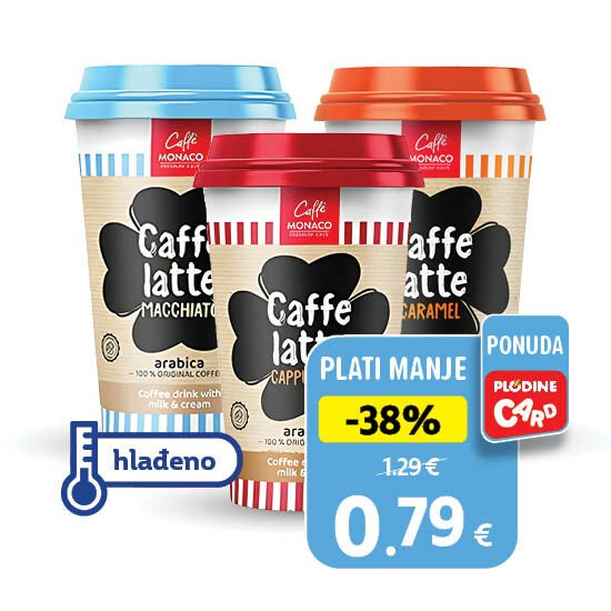 Ledena kava, cappuccino, macchiato, caramel ili espresso Monaco 230 ml može se kupiti u svim Plodine poslovnicama za 0,79 €. Ponuda je snižena sa 1,29 € za 39%. Ponuda vrijedi još 4 dana.