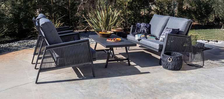 4-dijelni set, aluminijska konstrukcija zaštićena praškastim premazom u antracit boji, uže od tekstilen tkanine. Sastav: dvosjed, cca š/v/d: 134x85x93 cm, nosivosti do 240 kg; 2 fotelje, cca š/v/d: 74x85x93 cm, nosivosti do 120 kg; stolić, cca š/v/d: 110x44x56 cm, nosivosti do 30 kg