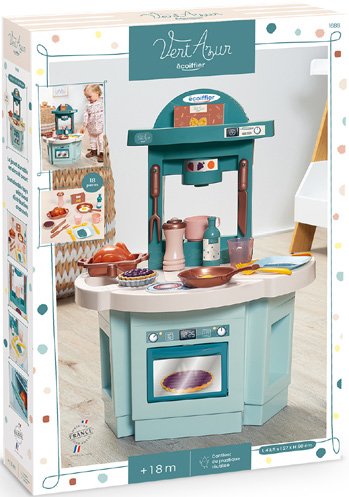 Prva kuhinja za djecu s pećnicom, sudoperom, pločom za kuhanje i mnogim dodacima.