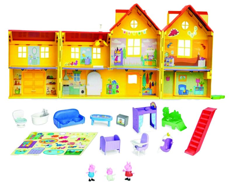 art. 1271306 Ovaj veliki, dvokatni set sa 7 soba otvara se preko 80 cm i prepun je dodataka koje djeca mogu koristiti za ukrašavanje i postavljanje kuće kako god žele, uključujući krevet na kat u duginim bojama za Peppu, krevet s dinosaurima za Georgea, kadu i kauč! Beba Evie ima ležaljku, hranilicu i kolijevku. Dob: 3+.