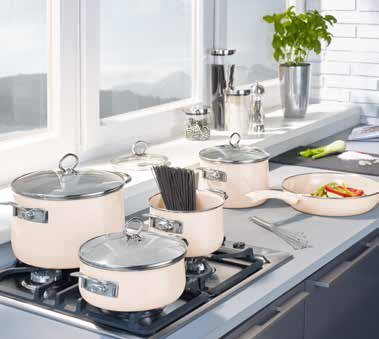 emajl, boja: bež, set sadrži 4 lonca različitih zapremnina sa staklenim poklopcima i tavu Ø 28 cm, otporno na temperature do 280°C, pogodno za sve vrste štednjaka. (38780001)