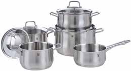 Cromargan®, nehrđajući čelik 18/10, polirano, TransTherm® dno, sastoji se od lonaca s 4 staklena poklopca: Ø 16 cm, 2x Ø 20 cm, Ø 24 cm i lonca s drškom Ø 16 cm, perivo u perilici posuđa, pogodno za sve vrste štednjaka