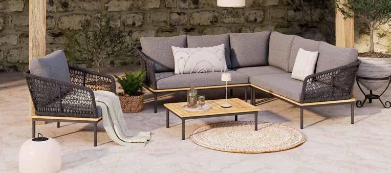 aluminijska konstrukcija zaštićena praškastim premazom u antracit boji, uže u prošarano sivoj boji, nauljeno, masivno drvo bagrema. Sastav: stol, cca š/v/d: 90x27x60 cm, nosivosti do 30 kg; dvije dvosjedne klupe, cca š/v/d: 128x79,5x71 cm, nosivosti do 240 kg; kutna klupa, nosivosti do 120 kg, cca 79,5x79,5cm; fotelja, 75x79,5x71 cm, nosivosti do 120 kg. (000W0001/19)